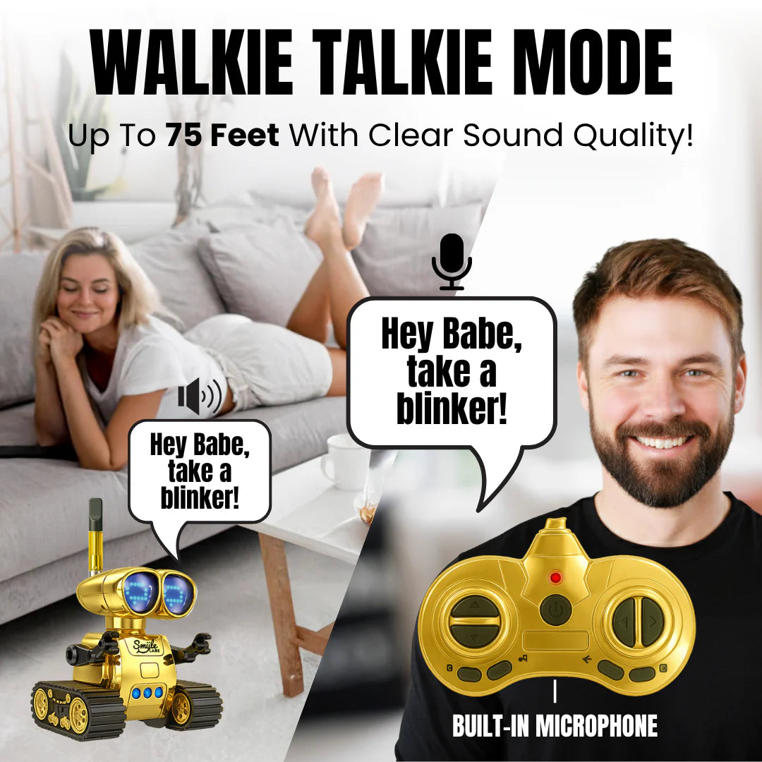 🤖 Blinks, Talks, and Vibes: Use walkie-talkie mode to send audio from the remote to the robot—up to 75 feet away!